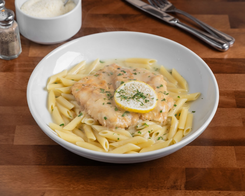 lightly egg battered, butter, lemon, white wine sauce, penne pasta